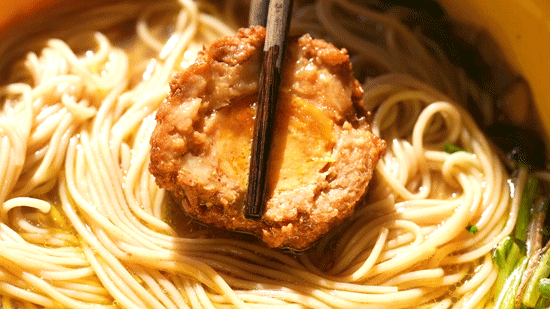 想吃汤面的朋友,可以试试咖喱牛肉汤面。在牛骨汤的基础上加了咖喱粉,顶上是足50g的安格斯牛胸肉片,最后加上小搓香葱,咪道香得嘞。额外配了份咸蛋黄狮子头,瘦肉用肥肉衬托、咸蛋黄沙沙软软,难怪在网上出镜率这么高。· 推荐搭配:咸蛋黄狮子头
