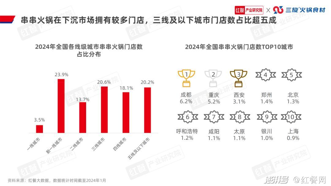 2.串串火锅在下沉市场拥有较多门店,三线及以下城市门店数占比超五成从串串火锅门店的线级城市分布来看,新一线城市占比最高,为23.9%。三线及以下城市串串火锅门店数占比为58.9%,高于火锅大盘在三线及以下城市的门店数占比。