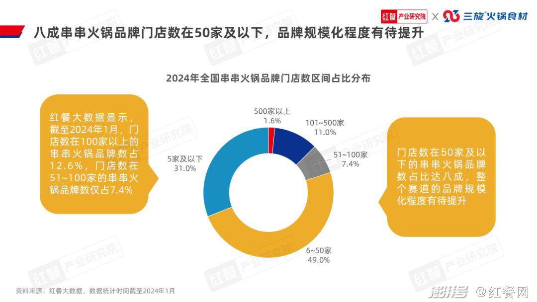 3.八成串串火锅品牌门店数在50家及以下,川渝地区的串串火锅品牌全国化进程领先红餐大数据显示,截至2024年1月,门店数在100家以上的串串火锅品牌数占12.6%,门店数在51~100家的串串火锅品牌数仅占7.4%。门店数在50家及以下的串串火锅品牌数占比达八成,整个赛道的品牌规模化程度有待提升。