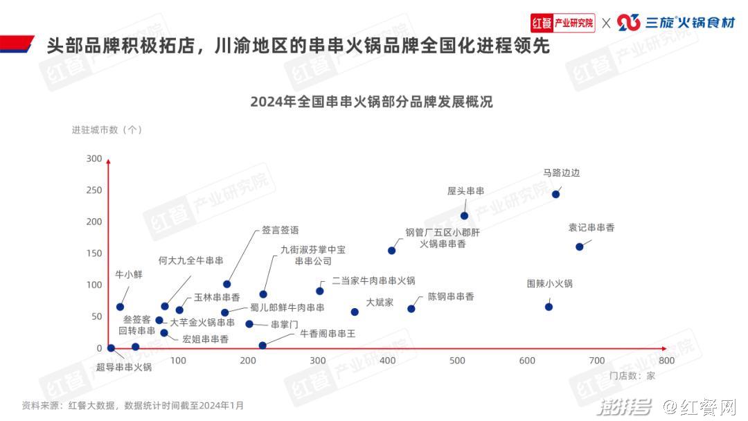 据了解,目前屋头当家菜系列产品的销量已经占其门店总销量的55%~60%,复购率达95%以上。红餐大数据显示,屋头串串门店数已突破500家,覆盖城市200余个。 3.与上游供应链企业牵手共创,加快串串火锅创新速度