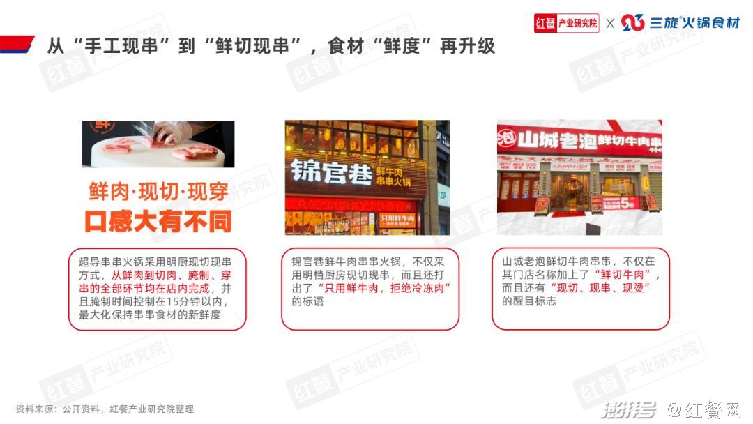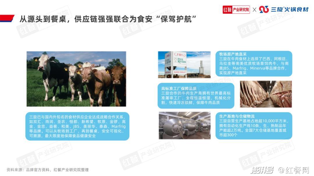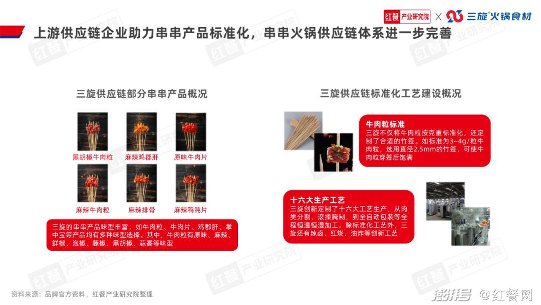 4.品牌通过自建或与上游供应链企业共创,进一步夯实供应链目前,火锅大赛道的供应链发展较为成熟和完善,这在某种程度上也带动了串串火锅赛道的供应链发展。目前,很多串串火锅品牌依托大型火锅企业或者专业调味料企业生产供应火锅底料;在食材供应方面,也有很多成熟的串串食材供应企业。