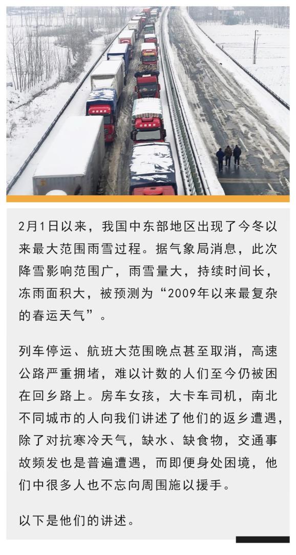 没想到堵了三次。先是长沙转华常高速堵了1个小时,好不容易到了两省交界,加个油出来,又停3个小时,动都没动。我下国道跑了4个小时,说岳宜高速通车了,我又上去。2月5号晚上10点进湖北,雪就铲出一条道,冰铲不动,车开得甩来甩去,怕出车祸,我出了一身汗。很快,又堵了1个小时,有人猜测是司机困了,前面走空了都不知道。路边有人吃火锅,也有好些车抛锚了。