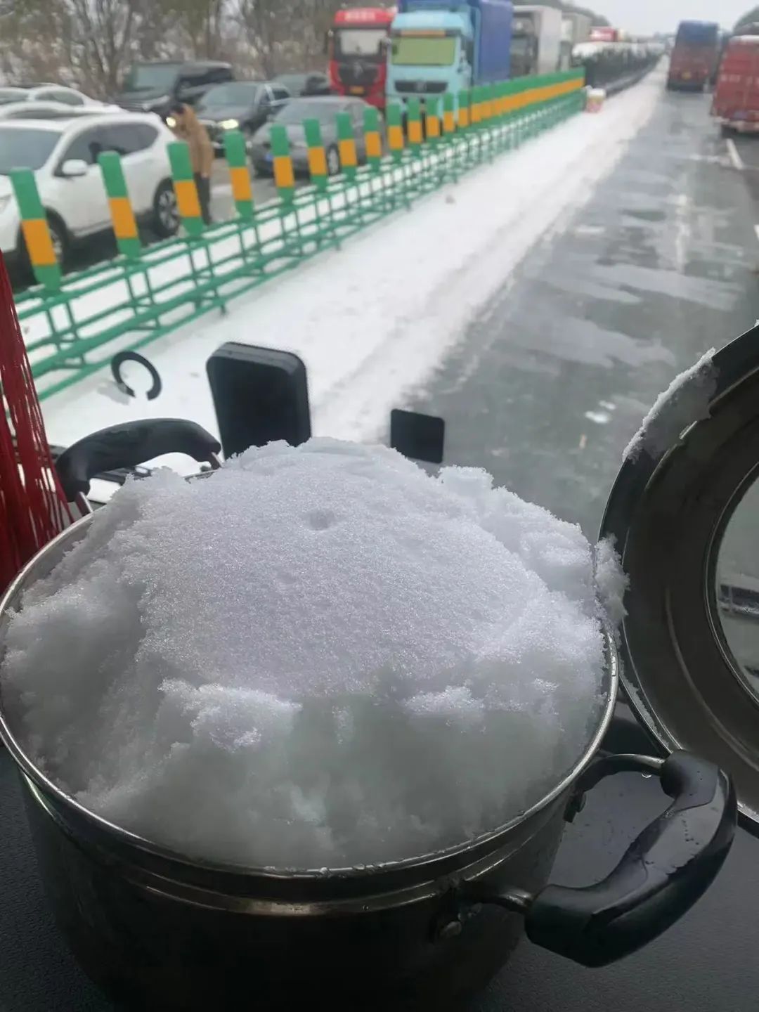 ●缺少饮用水,卡车司机化雪取水。讲述者供图。喝了两天雪水,到5号我们就完全揭不开锅了,交警给了我们俩一人两个小面包。现在回想,如果吃的和水没分给别人的话,我们应该能多撑一天。但不能不帮,我俩四十多岁,毕竟年轻嘛,能扛。