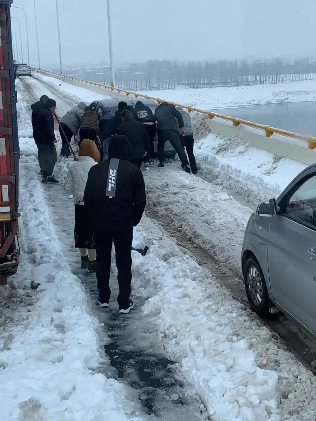 ●卡车司机被困路段及道路情况。讲述者供图。我们被困的这座桥有3公里长,可以说前不着村后不着店的,想买东西都不知道上哪买。4号白天我在车旁边铲雪,一个中年男人走过来,问我能不能帮他烧点水,他说他车上有七十岁的带病老人,还有小孩,一晚上没水喝,也没取暖,现在急需热水,不然老人身体扛不住。