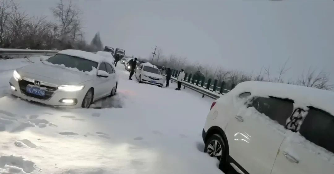 积雪和冻雨让桥面上的冰越来越结实,很多小车开到桥面站不住,出事故的也多,我看到最严重的一起,我特意数了下,11 辆小车,追尾堆在了一块。路上还能时不时见到侧翻到路边沟里的小车。