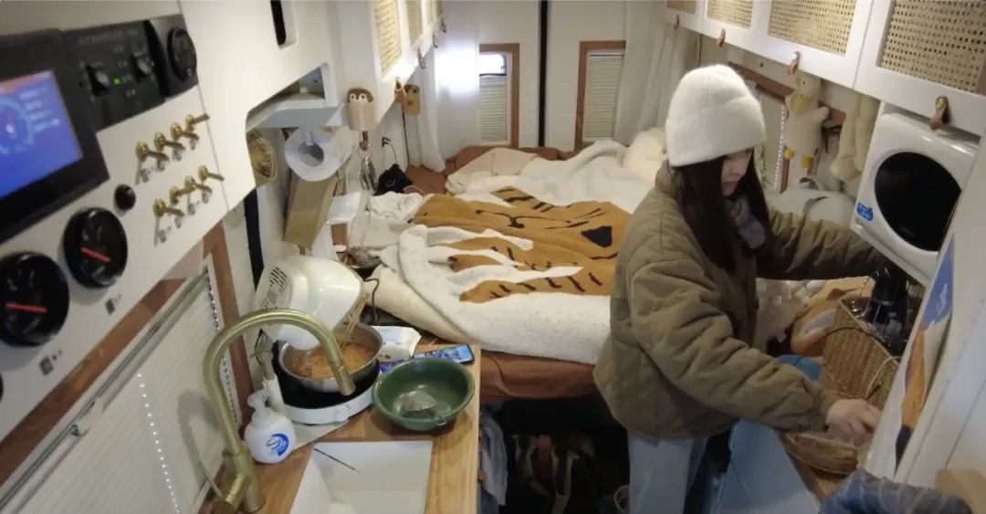 ●小末在房车内。讲述者供图。我的物资肯定是有限的,其实更多的是给到大家一些应急的帮助。我们出发时车里准备了足够的自来水、电,但冰冻天气还是超乎我们预料,怕冻坏车,中途倒掉了几桶水。房车靠行车动力发电, 路上断断续续地开,勉强把电充满了。剩下的食物目前也够我们俩支撑几天。