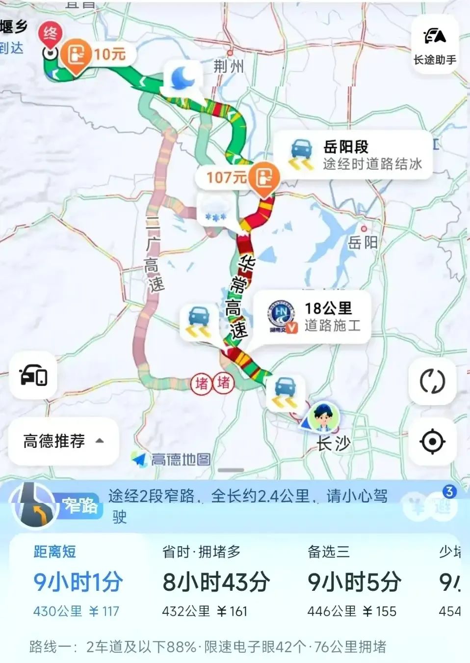 ●在长沙时查的返乡路线。讲述者供图。昨天(2月5日)我在路上开了十七个半小时,赶路,也不觉得困,中间就进服务区加了个油。我的车比我辛苦,买六七年了,底盘低,一路擦着雪过来,地盘“啵啵”响。一直开到今天凌晨3点半,到了离家30公里的另一个镇上。