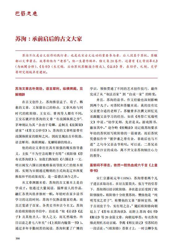 苏洵不仅是古文创作的践行者,也是北宋古文运动的重要参与者,后人因其子苏轼、苏辙都以文章著名,故尊称他为“老苏”。他一生著作颇丰,除文集20卷外,还著有《太常因革礼》(与姚辟合修)、《易传》(未完稿,后由苏轼苏辙接力续成)、《谥法》等,在经学、礼制、史学等研究领域卓有建树。