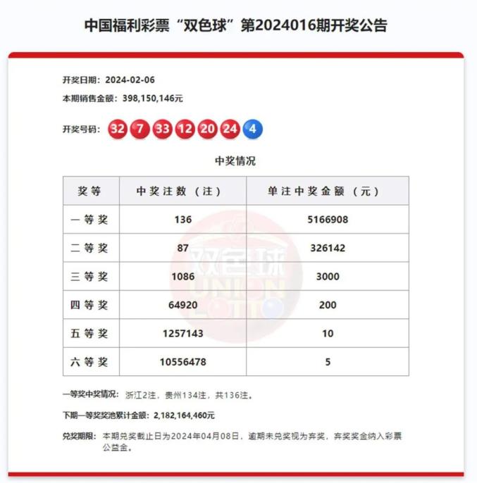 开奖公告据中国福利彩票“双色球”第2024016期开奖公告,一等奖136注,单注奖金金额516万余元,但贵州开出了134注一等奖,引发网民关注。极目新闻记者在中国福利彩票官网进一步检索发现,贵州开出的134注一等奖中,有133注均在安顺市平坝区第52032056号销售网点售出,分别为50注和83注。也就是说,这个销售网点共开出了6.8亿多元的巨奖。如果这两张倍投彩票为一人所得,那中奖人将刷新12年前北京一彩民中5.7亿大奖的纪录。