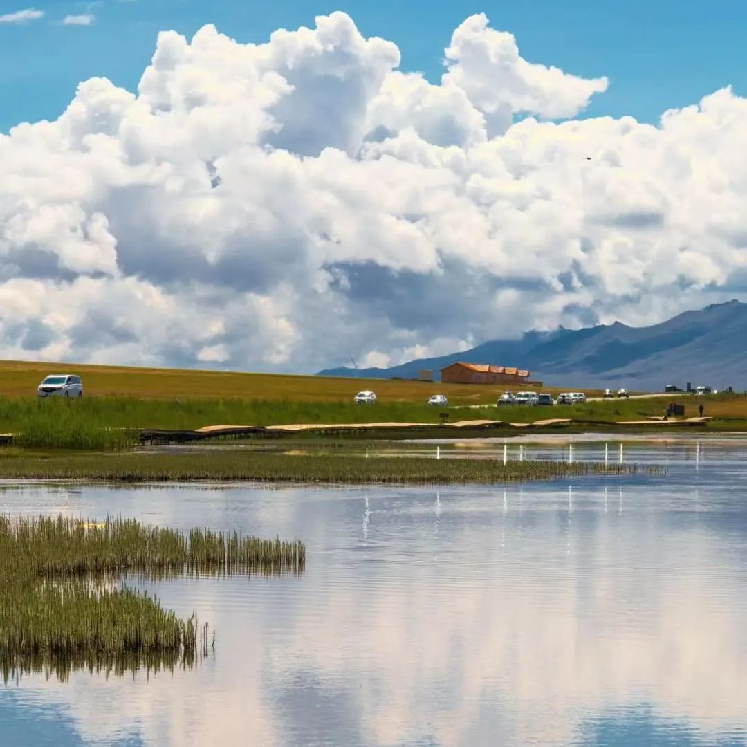 “这张照片是在新疆赛里木湖拍摄的,湖面如同一面巨大的镜子,倒映着蓝天白云的纯净,有风吹过便泛起涟漪。耳边萦绕着阿姨们欢乐共舞大唱大笑的声音,她们穿着最鲜艳的衣服奔跑,她们高举双手想要触碰天空,她们大叫露出最纯粹的笑,她们年轻而热烈。我竟也想加入阿姨们蹦蹦跳跳的队伍里,在赛里木湖,自由和快乐是不分年龄的。