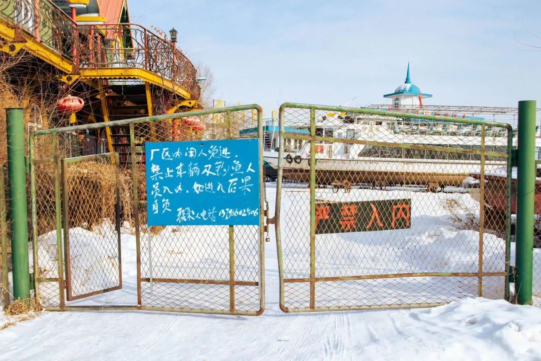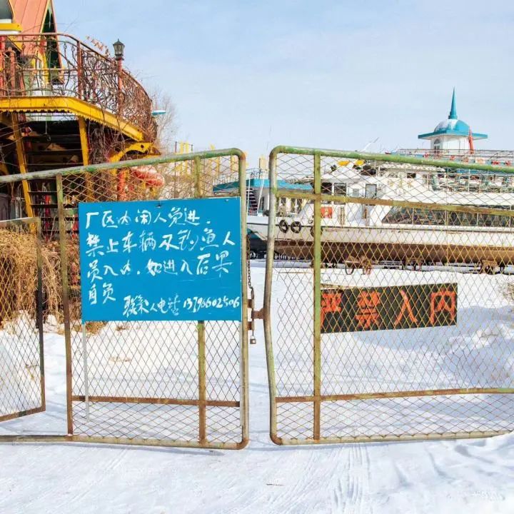 “这张照片拍摄于黑龙江省哈尔滨市一个废旧船厂。样式精美且色彩鲜艳的建筑被低矮破旧的栅栏圈禁,似在诉说昔日的繁华与喧嚣。蓬松的积雪上隐约有车轮的痕迹,可偌大的码头上只有静默的船只,“闲人免进”的牌匾成为方圆几公里内最安静的呐喊。”—王澜