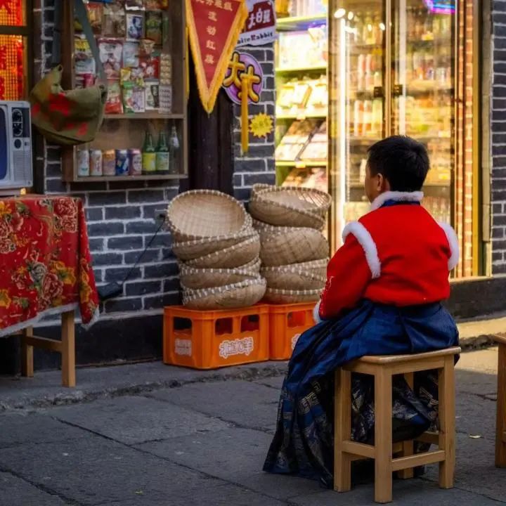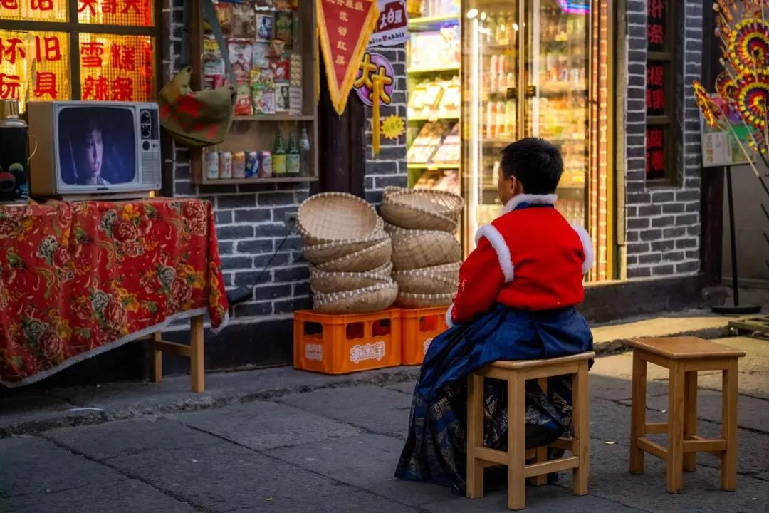 “这张照片拍摄于杭州市小河直街。这是一条商业化的历史文化小街,街区两旁已经换上应景的年味装饰。窄窄的街巷两旁开了好几家古风的妆造店,带着头饰的女孩们来来往往,闪光灯伴着人流声一下一下闪烁。但就在这个主打回忆感的小店前,好像世界一下子暂停,他在他的童年里品味几辈人的童年味道。他像年画里的小人,又跳出画面成为一幅画。没有人发现这一幕,我于是按下快门。”—戴兰馨