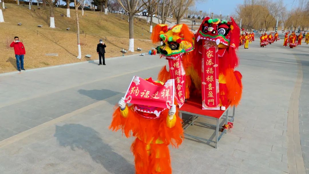太平鼓鼓声震天,60余人的团队,虽然平均年龄超过了55岁,但大家伙都是打了十多年的老手,跟着鼓点腾挪转移,动作节奏丝毫不比年轻人逊色,整齐划一的动作、欢快流畅的舞姿博得现场观众阵阵掌声。今年,除了太平鼓,社火队还增加了新项目:耍狮子,由社火队最年轻的几位成员担任,表演内容更加丰富、与观众的互动性也更强,您瞅瞅这“纳福迎祥”的横批您还满意吗!