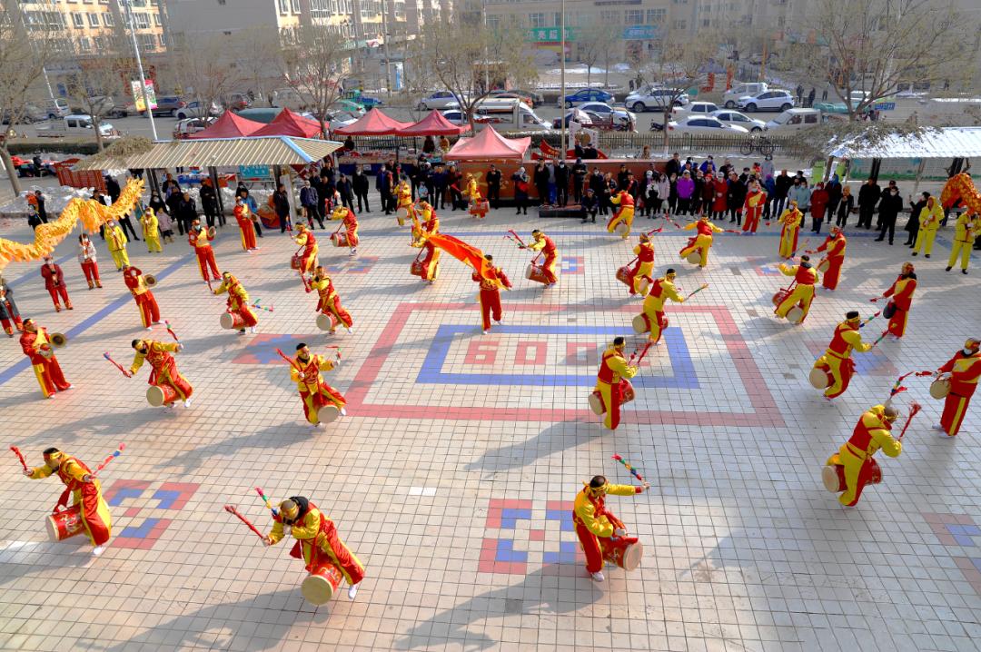 鞭炮响,社火到。武川新村社区广场上鞭炮齐鸣,准备“接社火”——武川乡碱台子社火队敲锣打鼓、耍着狮子舞着龙来了。