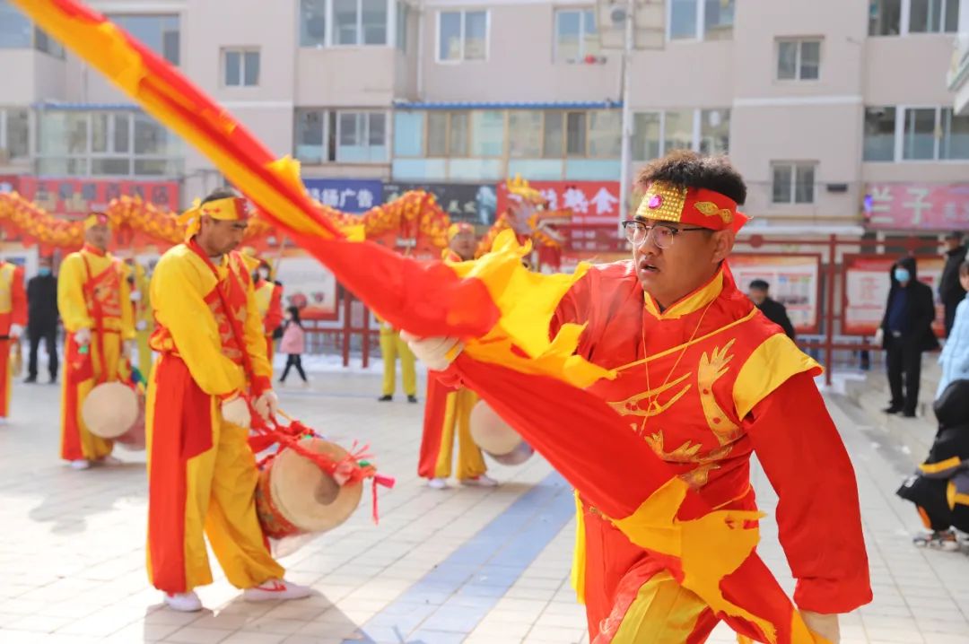 火红的绸子在雪地里上下飞舞,一派节日的热闹氛围。王岘镇社火队的《盛世欢腾》正在排练,热闹喜庆的音乐声响起,手持大红扇子的队员们自信登场,缎带翻飞像雪地里的红蝴蝶,随后手捧大红绣球的队员们踱着小碎步欢快上场,红绣球配上大家脸上的喜悦,在白雪的映衬下显得格外喜气洋洋。