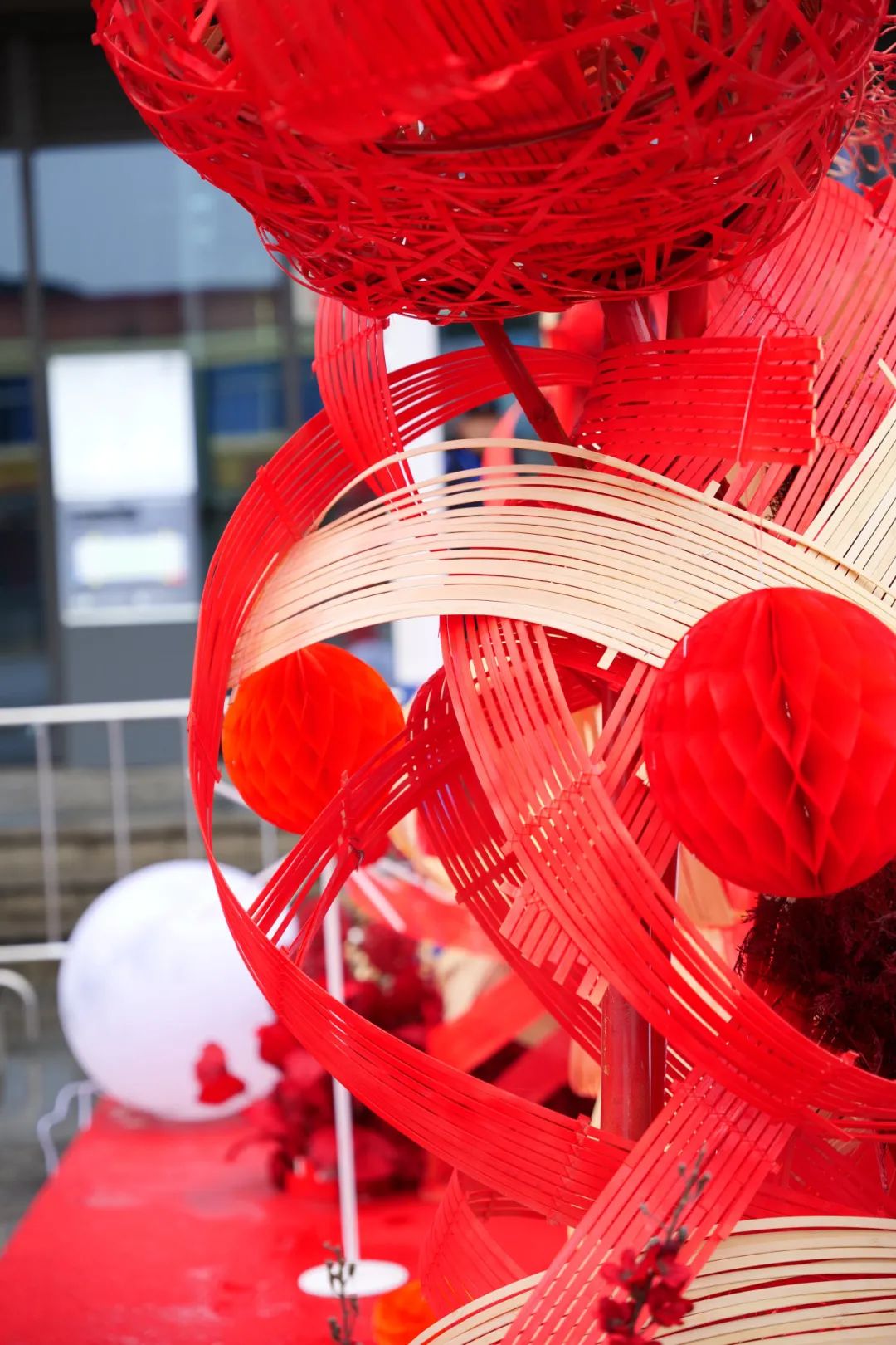 你看,站点门口,着大红色与原色搭配组合的竹编,是不是正升腾起“龙”之形态?加上那两个当作眼睛的红灯笼,更添一份可爱生动。