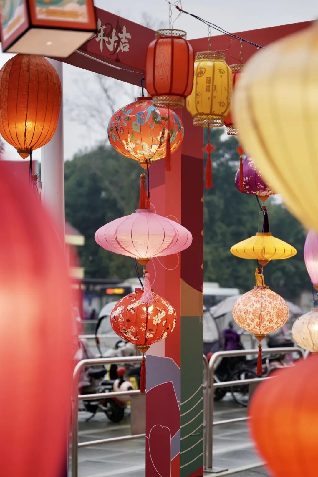 看完可爱的竹编龙,眼前另一片绚烂的“红”,同样不容错过。地铁站另一侧,由羊皮纸制作的灯笼,组成了一道华美的梦幻长廊。白日里,踏入其中,形态各异、色彩斑斓的漂亮灯笼,令人移不开眼。