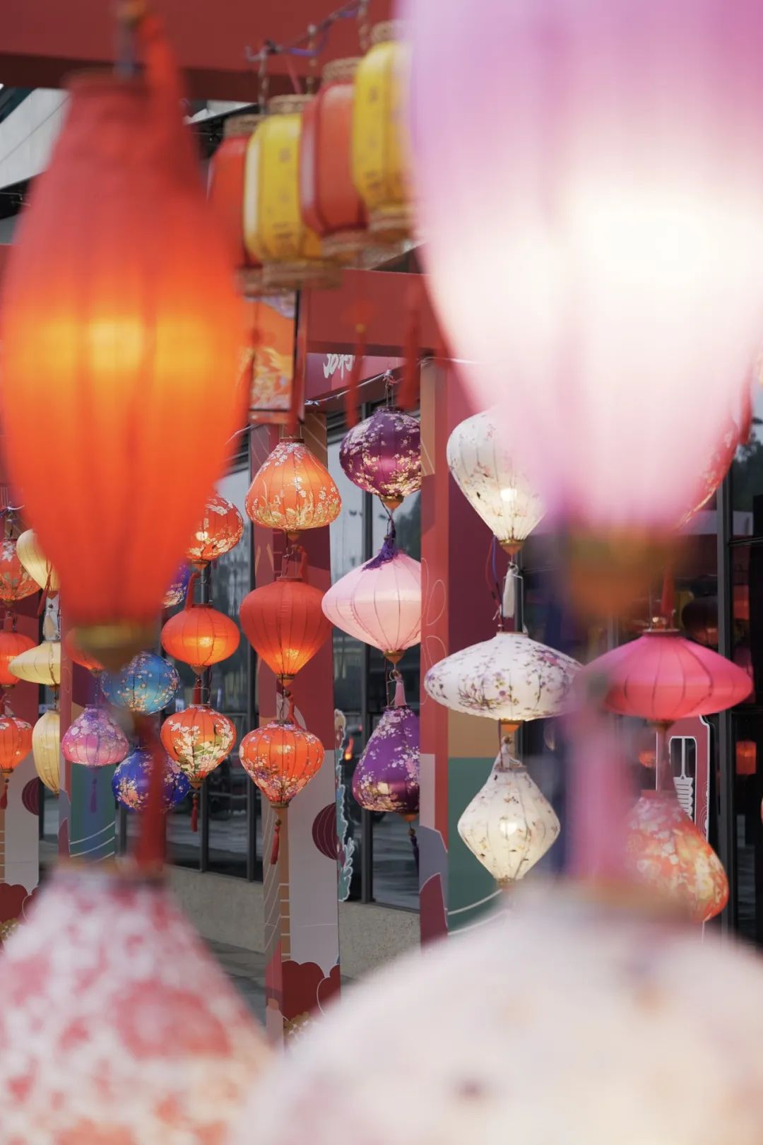 待到夜幕降临,亮起的灯笼,发出光,连成路,倒映在一侧玻璃上——赏灯看景,则又是另一幅美妙景象。