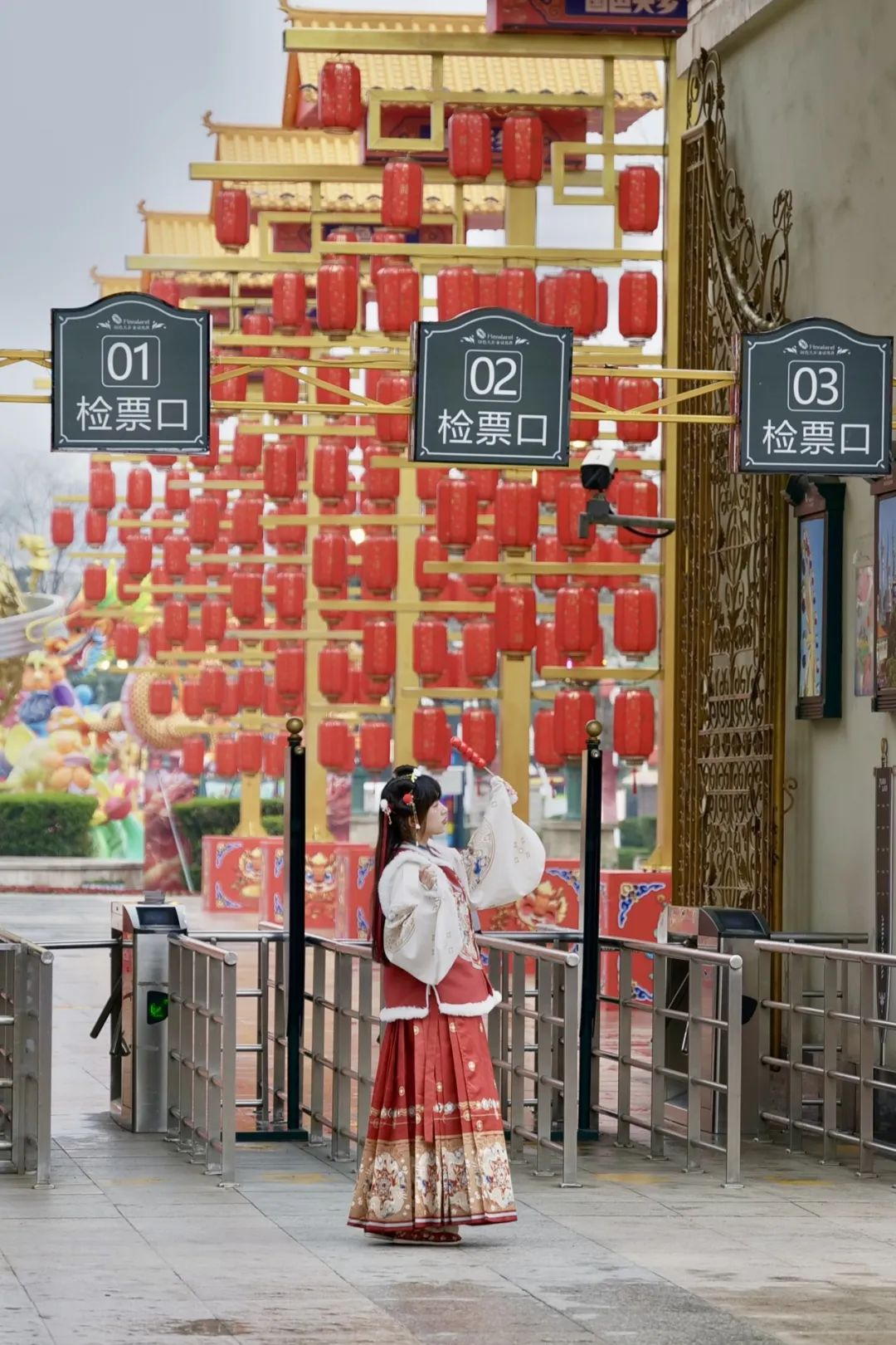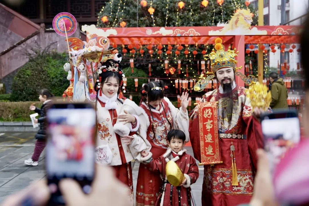 为了不“浪费”这特定美景,你看,穿着汉服前来的姑娘,正在门口拍照打卡。红红火火、漂漂亮亮的人与景,和谐美妙。