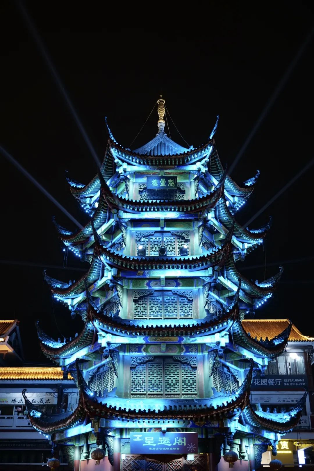 就在这般热闹里,夜幕落下,高耸的魁星楼亮起灯光,璀璨夺目。