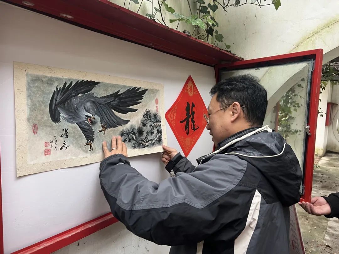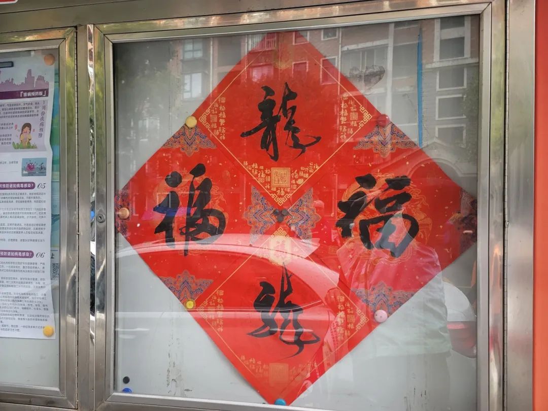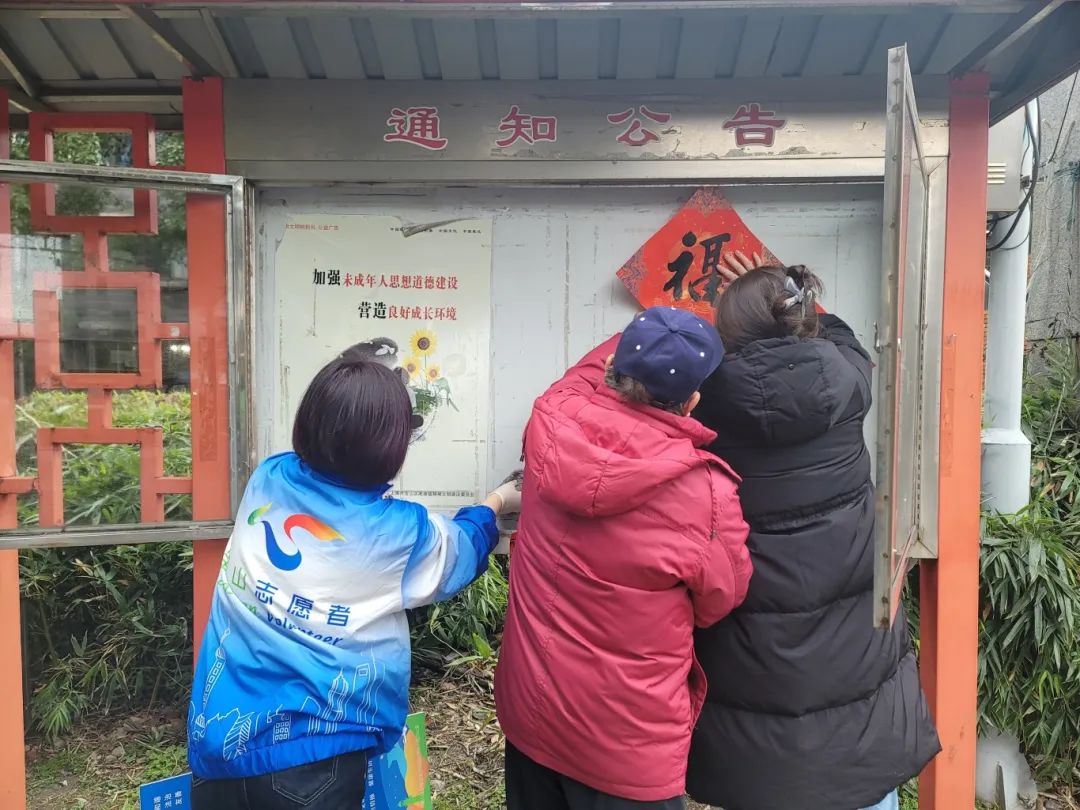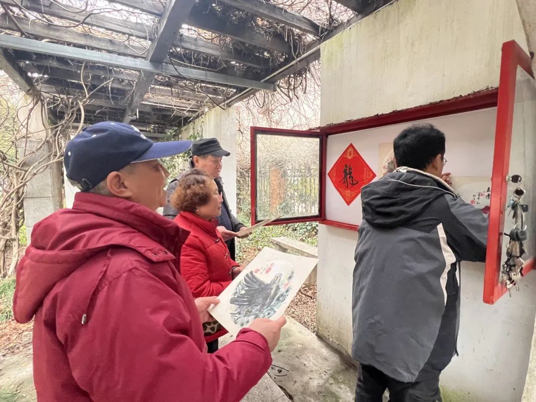 “香悦廊”是嘉骏香山苑小区的“最美小景”之一,是居民们休闲散步的好去处,长廊曲径通幽,两侧种植了桂花树、竹子、紫藤,漫步其中,处处成画。嘉骏香山苑居委深挖社区资源,邀请香山苑书画社老师将精心创作的春节主题作品在“香悦廊”内进行展示,让“香悦廊”成为萦绕着浓浓年味的温馨好去处。同时,嘉骏香山苑居委组织志愿者在社区宣传栏内张贴“福”字,擦亮文明宣传“窗口”,提升社区“颜值”,将这份深深的祝福送给每位居民。