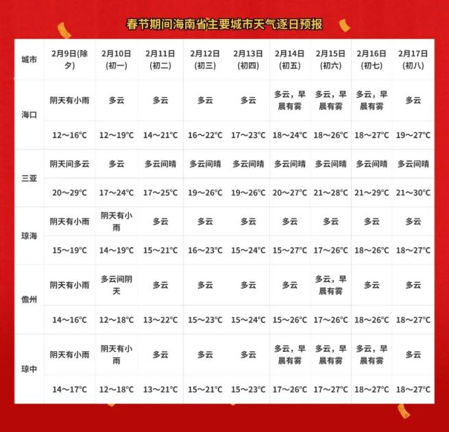 2月8日~11日(廿九~初二),受冷空气影响,海南岛有一次降温降雨天气过程。其中8日~9日,海南岛北部、中部和东部地区(海口、文昌、琼海、万宁、定安、澄迈、屯昌、儋州、琼中等市县)有小雨,个别乡镇有中雨,海南岛西部和南部地区多云天气为主,局地有小阵雨。9日~10日最低气温五指山以北大部地区12~16℃,五指山以南地区15~18℃;最高气温五指山以北大部地区14~20℃,五指山以南地区21~26℃。