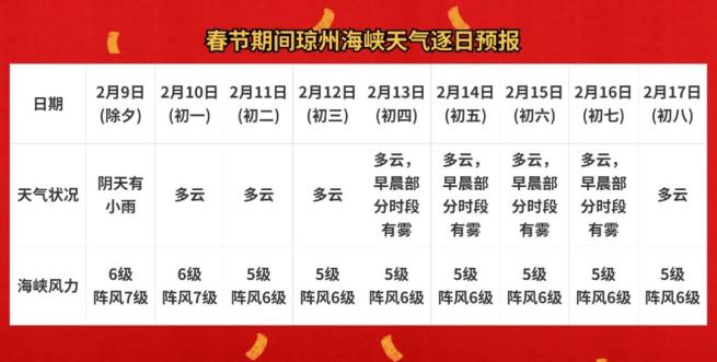 2月8日~10日,琼州海峡风力6级、阵风7级,海南岛南部海面和南沙群岛附近海域风力5~6级、阵风7级,海南岛东部和西部海面、北部湾海面、西沙和中沙群岛附近海面风力6~7级、阵风8级。