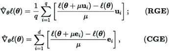 零阶优化器仅通过提交输入和接收相应的函数值与目标函数进行交互。主要有两种梯度估算方法:坐标梯度估算(Coordinate Gradient Estimation, CGE)和随机梯度估算(Random Gradient Estimation, RGE),如下所示: