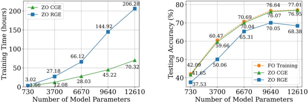 与 CGE 相比,RGE 具有可以减少函数评估次数的灵活性。尽管查询效率高,但 RGE 在从头开始训练深度模型时是否能提供令人满意的准确性仍不确定。为此,我们进行了调查,其中我们使用 RGE 和 CGE 对不同大小的小型卷积神经网络(CNN)在 CIFAR-10 上进行了训练。如下图所示,CGE 可以实现与一阶优化训练相当的测试精度,并显著优于 RGE,同时也比 RGE 具有更高的时间效率。