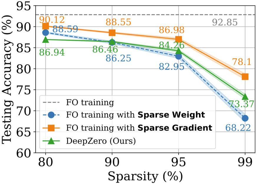 如下图所示,尽管在 80% 至 99% 的稀疏区间中,与(1)相比,使用 DeepZero 训练的模型仍存在准确度差距。这突出了 ZO 优化用于深度模型训练的挑战,其中高稀疏度的实现是被期望的。值得注意的是,在 90% 至 99% 的稀疏区间中,DeepZero 优于(2),展示了 DeepZero 中梯度稀疏性相对于权重稀疏性的优越性。