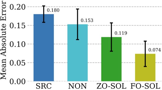 每个测试模拟的误差计算为与高保真模拟相比的纠正模拟的平均绝对误(MAE)。结果表明,通过 DeepZero 实现的 ZO-SOL 在只有基于查询的模拟器访问权限的情况下依然优于 SRC 和 NON,并缩小了与 FO-SOL 的性能差距。与 NON 相比,ZO-SOL 的表现突显了在有黑盒模拟器集成时的 ZO-SOL 前景。