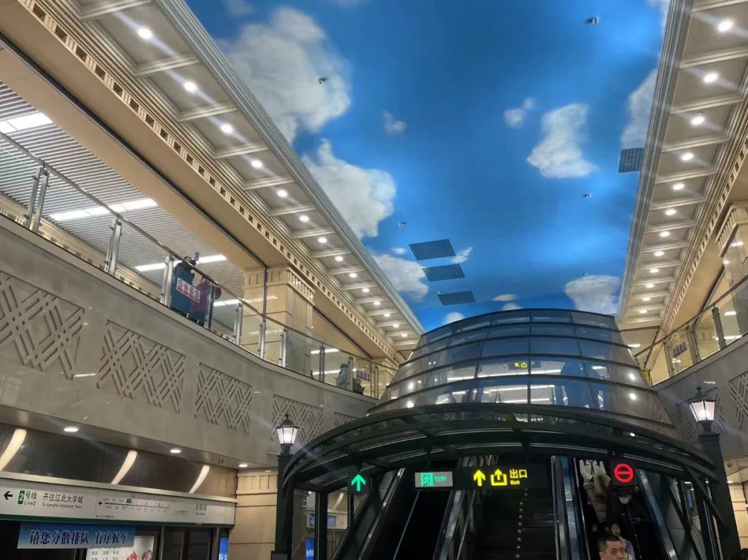 太阳岛车站是哈尔滨地铁的一个旅游车站,采用的是中庭式设计,楼扶梯处搭建欧式独有的铁艺结构空间,天花板上彩绘了蓝天白云,衬以灯光的模拟,将太阳岛的风景如画从地上延续到地下。