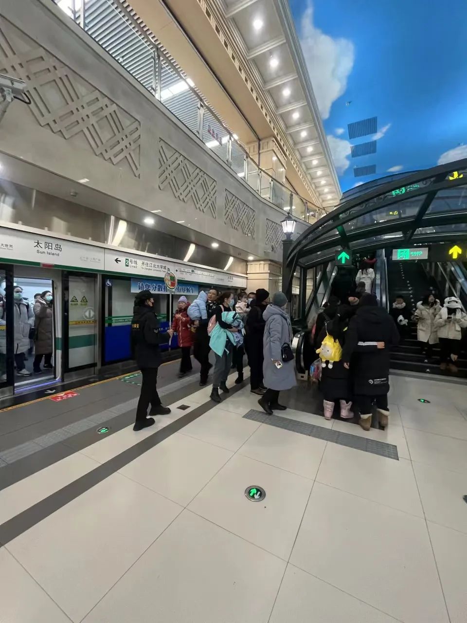 为了保障春节期间乘客出行,太阳岛车站每天都有19名工作人员值守在工作岗位,高峰时段设专人在电梯旁进行引导。一旦有更多的客流,还会有邻近车站的人员前来支援。