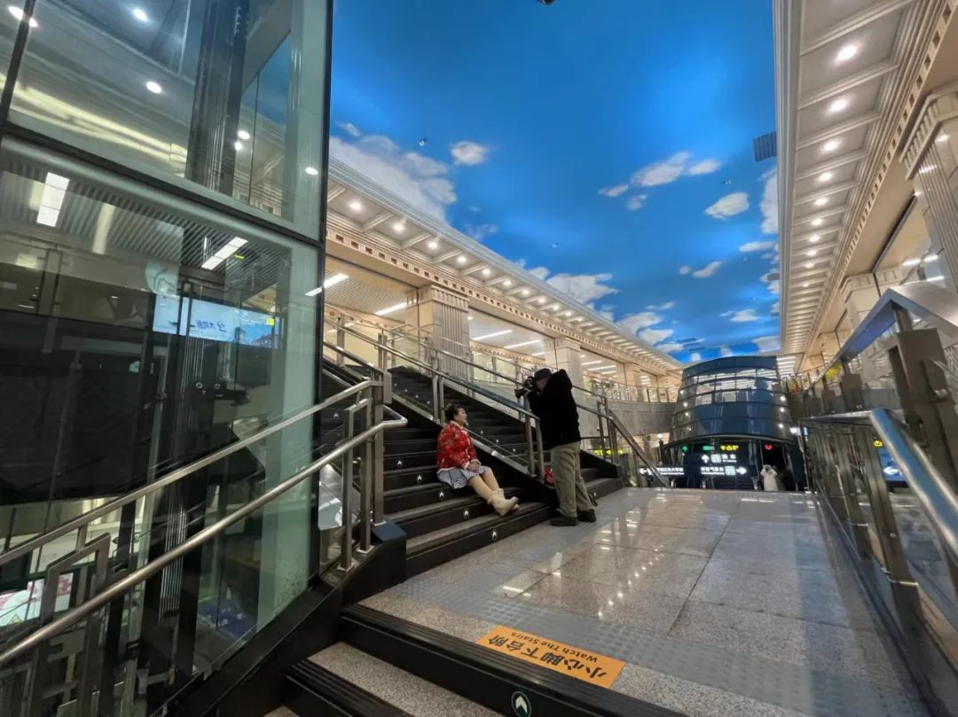 “太漂亮了!”在太阳岛地铁站蓝天白云的高高穹顶下,不时有游客打卡拍摄。