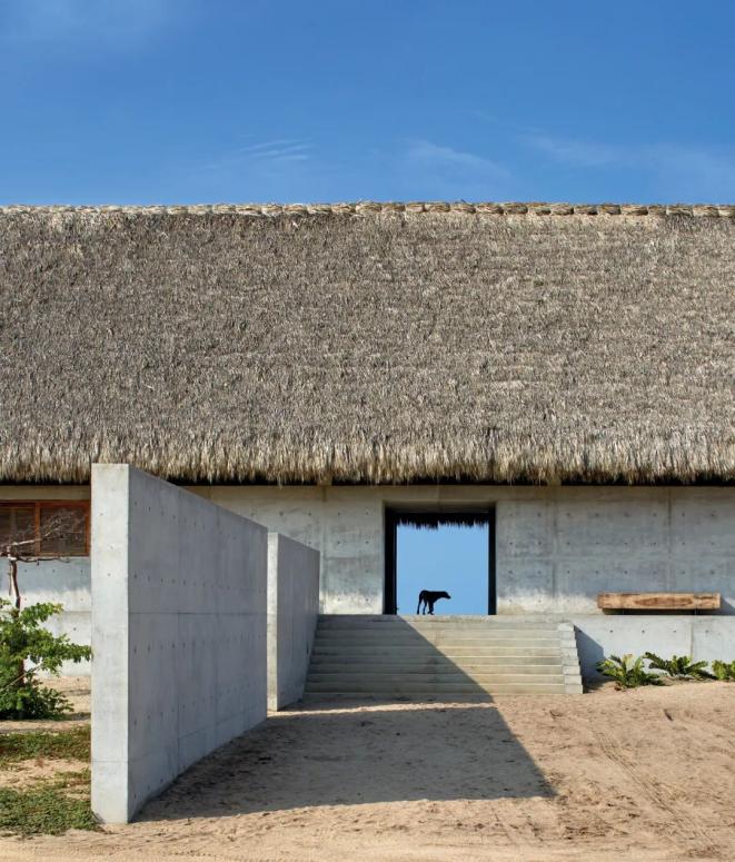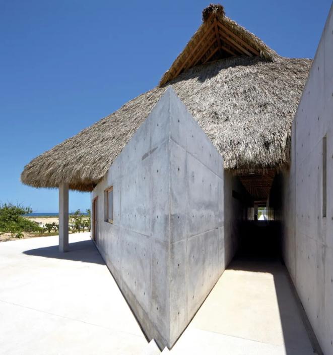在面朝太平洋的长550米的海滨岸线上,安藤忠雄以其标志性的混凝土构建了房屋墙壁,但远远望去,在低矮的灌木丛中,他们如茅草屋一般。