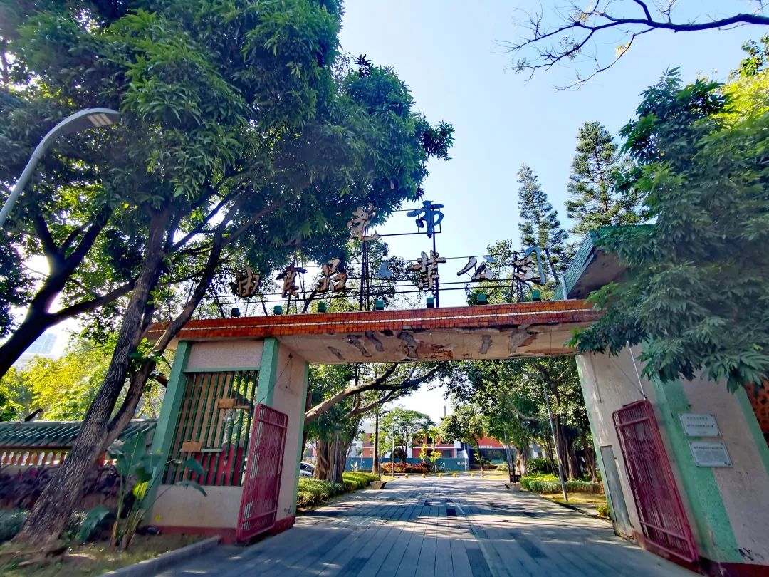门楼上,残缺的“粮”“工”两字并未被今天的建设者刻意补上,但彩色的琉璃瓦、干净的水磨石墙、岭南园林风格的凉亭,无不彰显出昔日的大门庭风采。