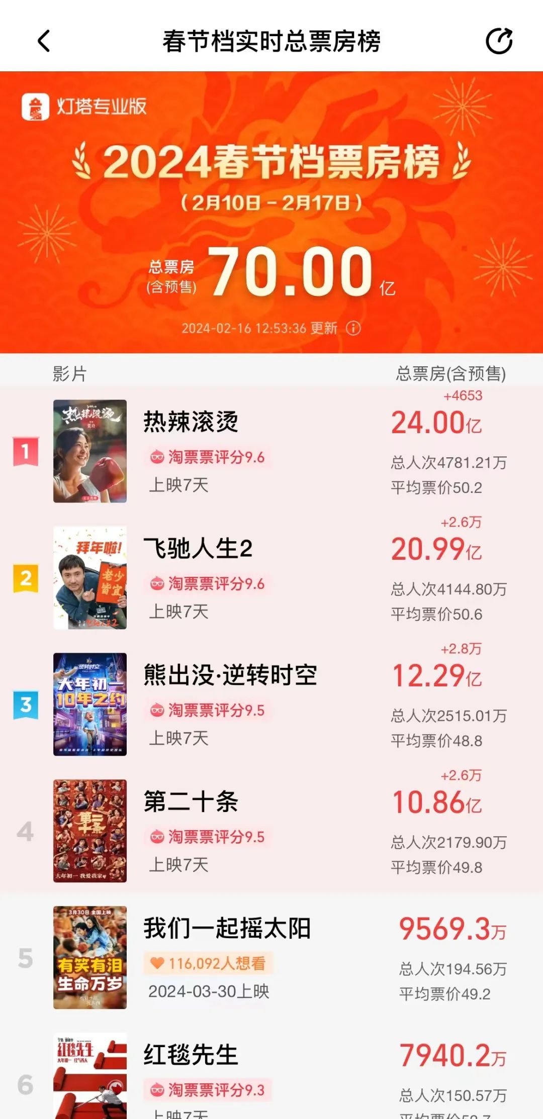 据灯塔专业版数据,截至2月16日12时53分,2024年春节档(2月10日—2月17日)档期总票房(含预售)突破70亿元。排名前三的影片分别是《热辣滚烫》(24亿元)、《飞驰人生2》(20.99亿元)、《熊出没·逆转时空》(12.29亿元)。此外,张艺谋导演的《第二十条》票房亦突破10亿元。