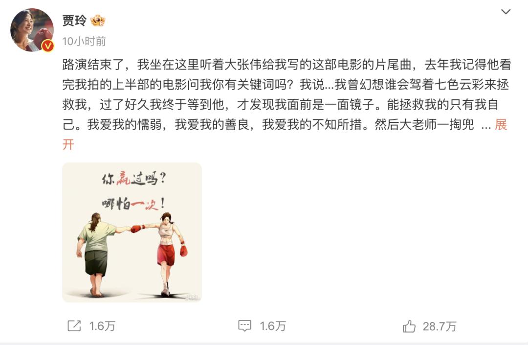 全文如下:路演结束了,我坐在这里听着大张伟给我写的这部电影的片尾曲,去年我记得他看完我拍的上半部的电影问我你有关键词吗?我说…我曾幻想谁会驾着七色云彩来拯救我,过了好久我终于等到他,才发现我面前是一面镜子。能拯救我的只有我自己。我爱我的懦弱,我爱我的善良,我爱我的不知所措。然后大老师一掏兜儿就拿出了这首巨作!