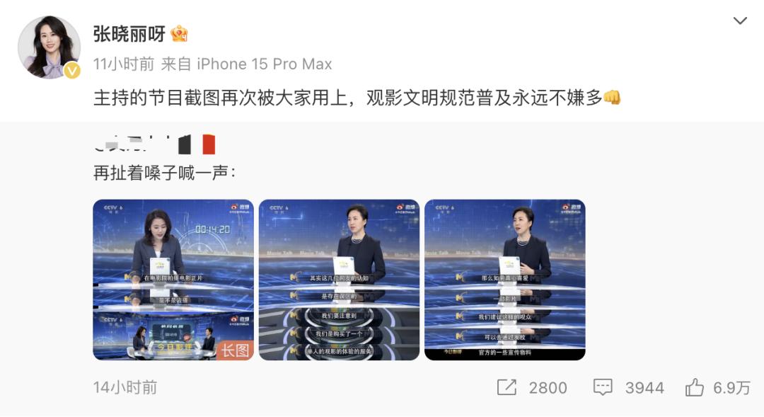 今日凌晨,该节目主持人亦转发该微博,称“主持的节目截图再次被大家用上,观影文明规范普及永远不嫌多”。