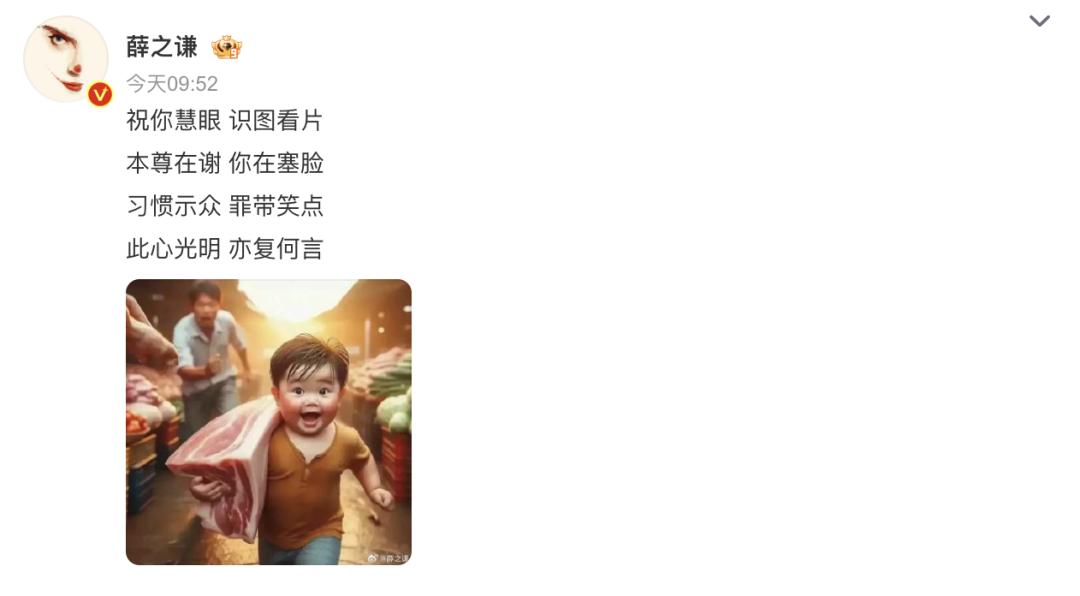 今日早间,薛之谦在微博上发布了一条打油诗,疑似回应质疑。“祝你慧眼,识图看片,本尊在谢,你在塞脸,习惯示众,罪带笑点,此心光明,亦复何言。”