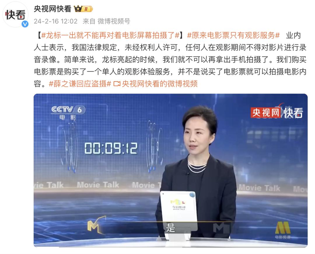 今日午间,央视网快看发布视频称,业内人士表示,我国法律规定,未经权利人许可,任何人在观影期间不得对影片进行录音录像。简单来说,龙标亮起的时候,我们就不可以再拿出手机拍摄了。我们购买电影票是购买了一个单人的观影体验服务,并不是说买了电影票就可以拍摄电影内容。