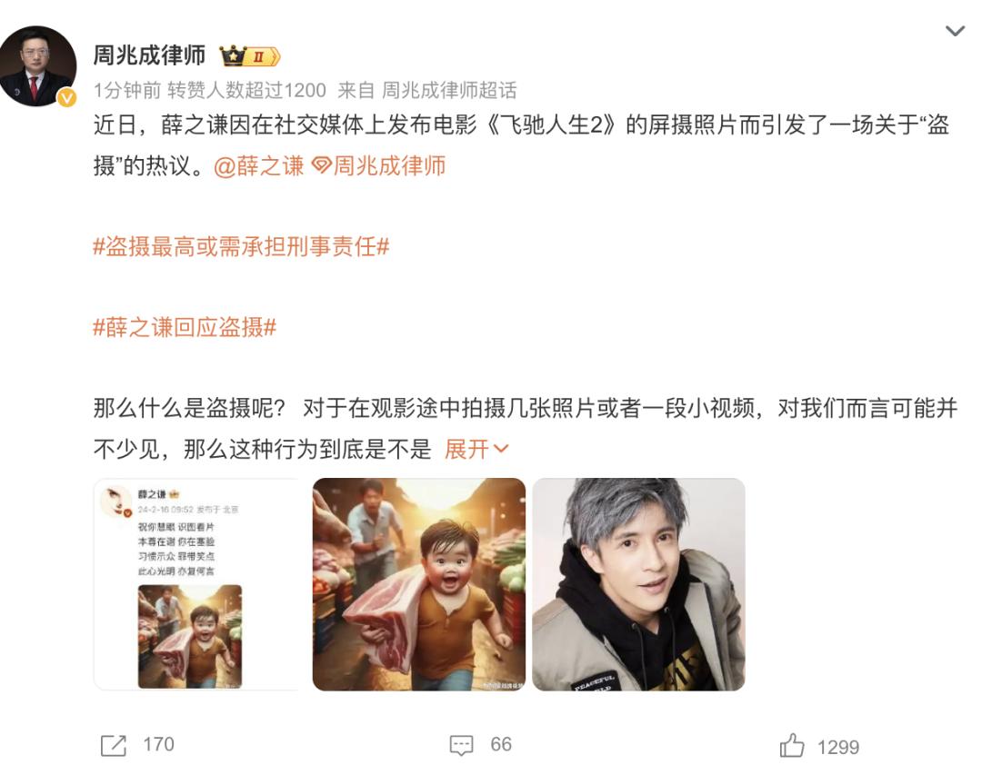 不过,该影评中的配图却引发了巨大争议,“薛之谦 盗摄”的话题词一度直冲热搜第一的位置。有网友质疑,薛之谦配图涉嫌盗摄,并引用了CCTV-6电影频道曾邀请北京市天元律师事务所合伙人曾雯雯律师就“盗摄”详细解释的视频截图。