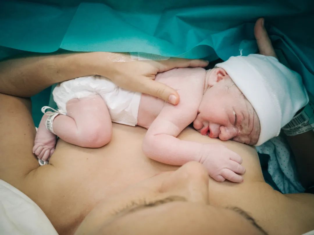 只要环境温度、宝宝的身体情况允许,要即刻(5分钟内)让宝宝和妈妈开始肌肤接触,并不间断地持续至少60分钟。让宝宝听到妈妈的心跳,给宝宝安全感。肌肤接触的同时,宝宝也会主动寻找妈妈的乳头,宝宝生下了就会吸吮,尽快让宝宝吸吮不仅能帮助宝宝获得安全感,获得初乳,也更利于妈妈子宫收缩,恶露排出,减少产后出血。