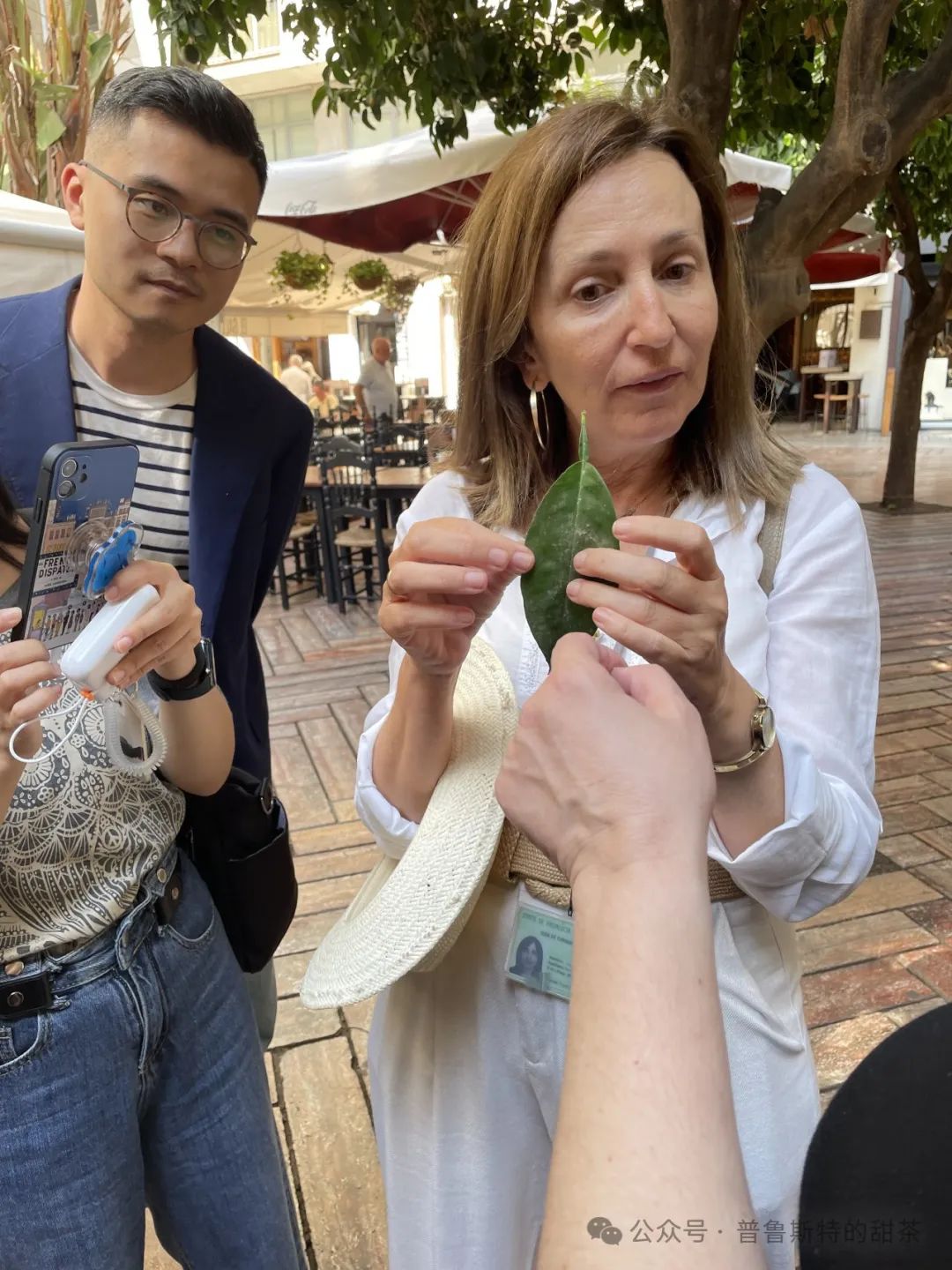 我们路过街上的橘子树,她告诉我们怎么区分甜的橘子,她采摘树上的树叶,说起圆的叶子、双层的叶子就是苦橘子。每年有两季橘子,夏季橘子和冬季橘子,随后果子会掉下来。路人都可以随意摘桔子。