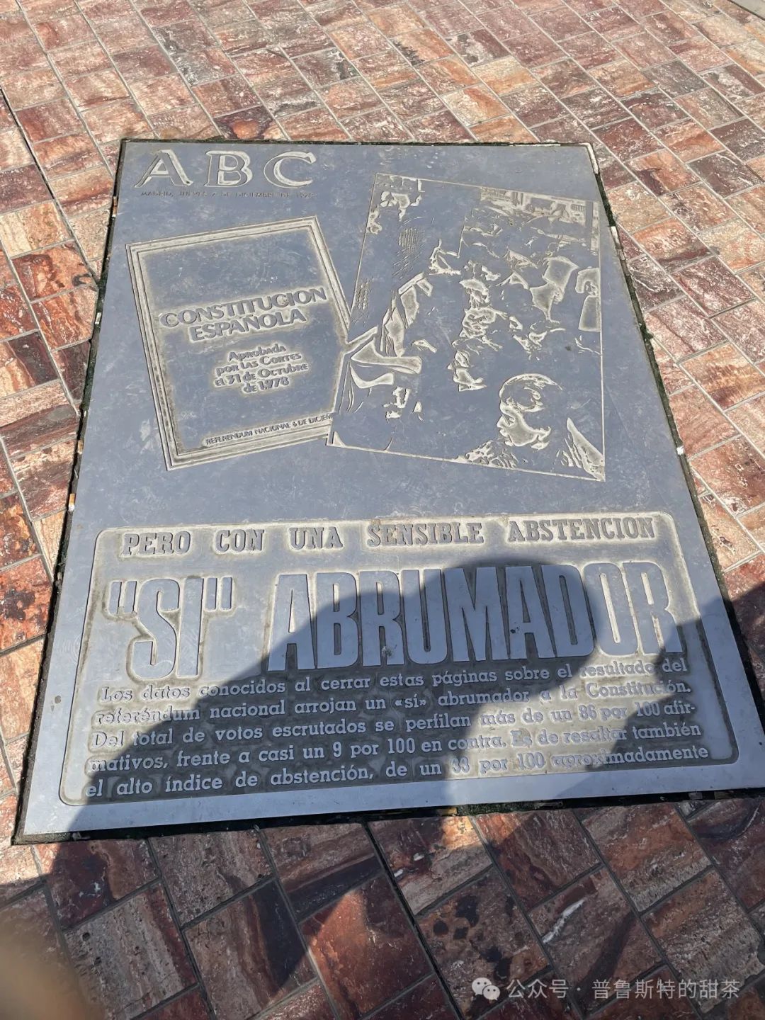 宪法广场是更名后的名称。这里立起宪法的旗子,能看到一些历史档案,其中又最重要报纸的一些页:弗朗哥去世三年之后,西班牙举行了全民选举,问西班牙人是否想建立民主政体,1978年12月6日,大家都给出肯定的回答,我们能在报纸的底部看到这则消息。这就是为什么12月6日是宪法日,是西班牙人的假期。这里还有一个喷泉,建于16世纪。后来这条街的历史部分被扩展,变成步行街。这是这个城市最重要的部分和最重要的街道。