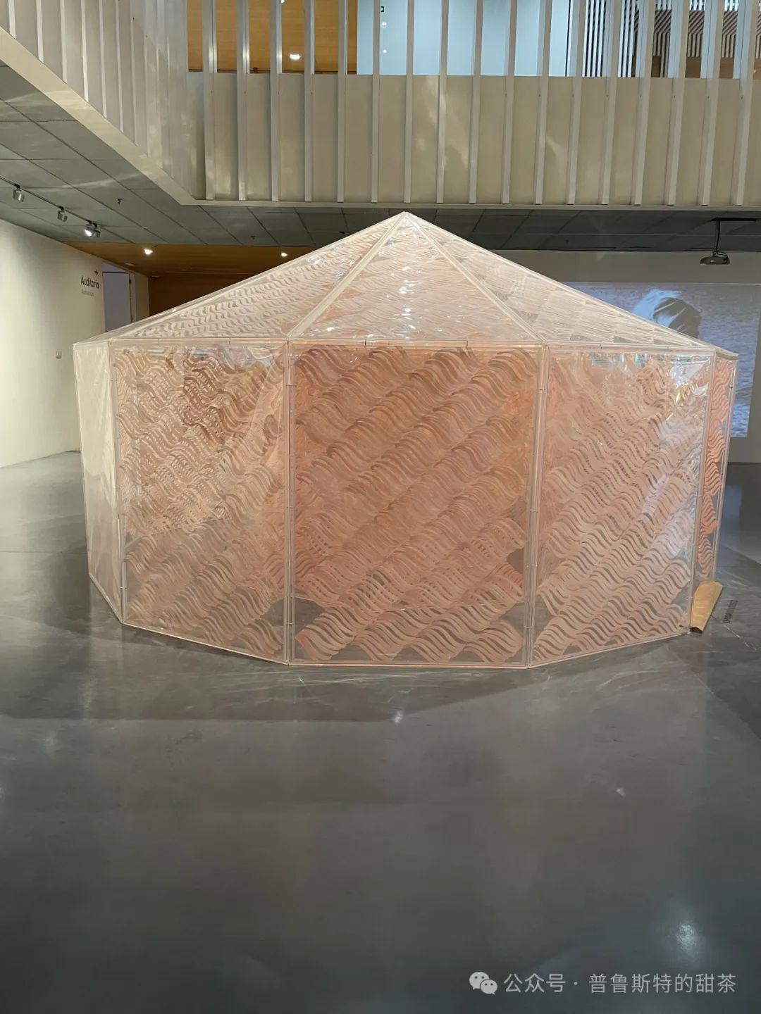 午餐过后,告别来自欧洲各地的同伴,我和那位德国记者老爷爷去往马拉加的蓬皮杜中心,走进玻璃五彩魔方一般的入口,展签文字盘桓在自我和内在之中,而我本能被一些装置作品所吸引,诸如一个粉色的透明塑料帐篷形状的装置,传达一种超现实又温馨简约的感觉;还有从上垂吊下来的一条条编织物,底部是黄色的鼓胀形状,宛如漫步在菌类丛林之中。