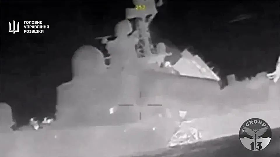 一艘无人艇向导弹艇中部船体撞去,图源:GUR 公布的视频截图14 日,GUR 又发布了一段视频,宣称用无人艇击沉了俄罗斯黑海舰队大型登陆舰"凯撒·库尼科夫"号(Caesar Kunikov)。