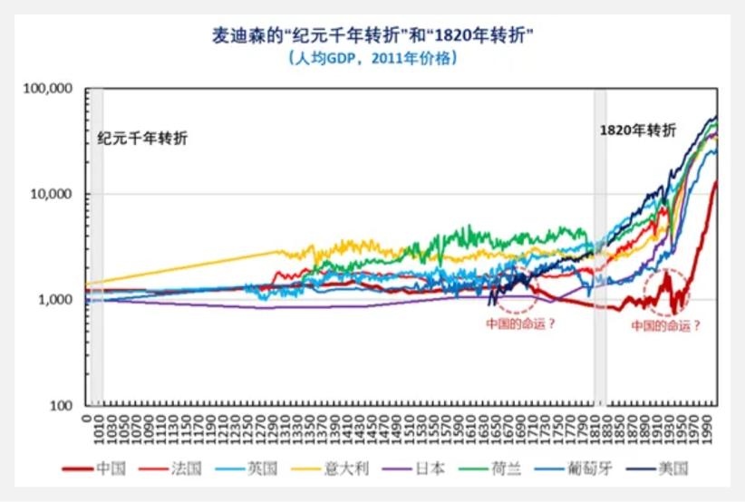 西欧在公元第一个千年里的人均GDP基本没有增长,在450国际元以下,1000年到1500年才有起色。中国第一个千年的人均GDP略高于西欧,但也是千年停滞。