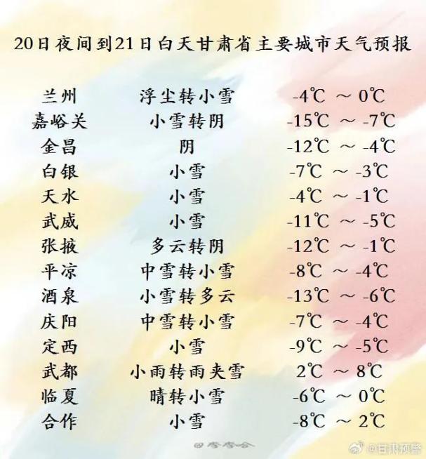 今天夜间到明天白天(02月20日20时-02月21日20时),天水、平凉、庆阳三市阴有小到中雪,局部地方有大雪;兰州、白银、临夏、定西、甘南、陇南等市州阴有小雪(雨)或雨夹雪,局部地方有中雪;省内其余地方多云,部分地方阴有小雪。另外,酒泉市有4-5级偏东风,酒泉、平凉、庆阳三市局部地方有雾。