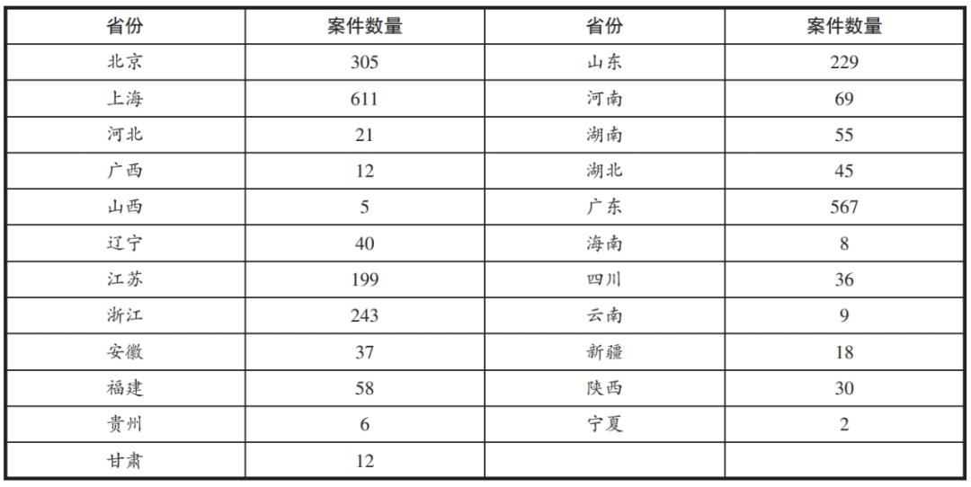 表1 互联网不正当竞争案件根据表2可知,这些案件分布于我国东、中、西部地区的23个省份,具有非常广泛的适用基础,也从另一侧面体现出互联网不正当竞争纠纷具有的广泛分布性。需要注意的是,许多的互联网不正当竞争案件都是系列性案件,即被控从事不正当竞争行为的公司相对固定,但起诉的原告则有所不同。同时,该类型案件由于普遍涉及范围较广、涉及人数众多、给社会造成的影响也较大。
